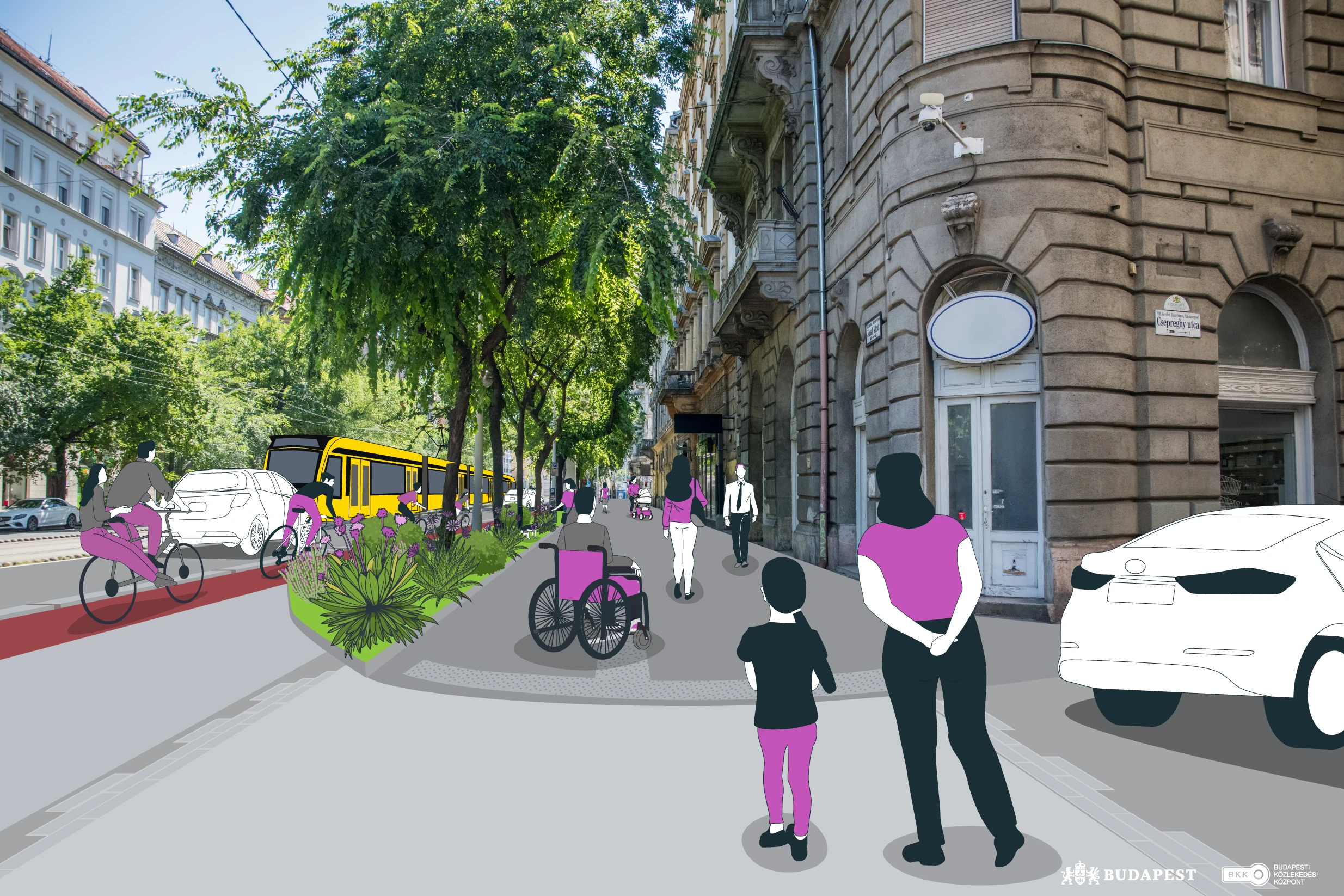 - A korábban kialakított szűkületek felszámolásával szélesebbek lesznek a járdák, megszűnnek a járdán vezetett kerékpársávok: kényelmesebb és biztonságosabb lesz a Nagykörúton sétálni.