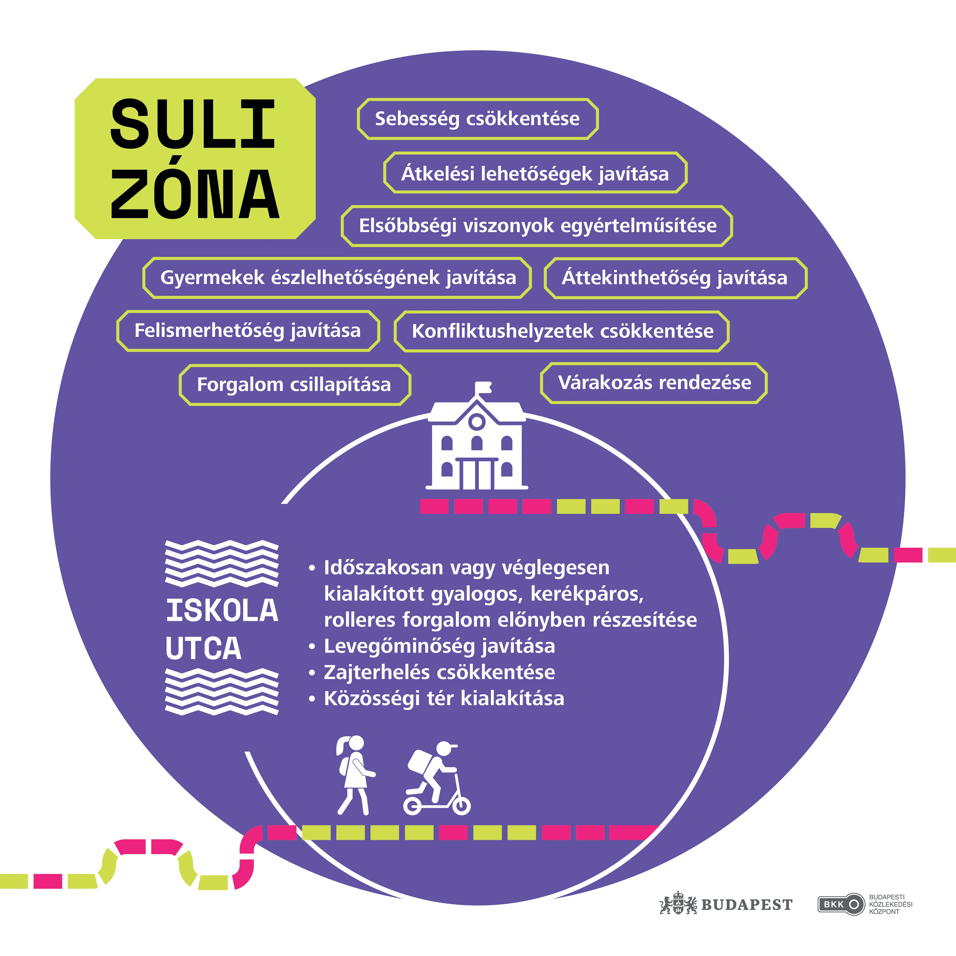 - Az iskolák előtti és melletti utcákban színes, figyelemfelhívó „Sulizóna” táblák kihelyezésével, kapcsolódó útburkolatfestéssel,