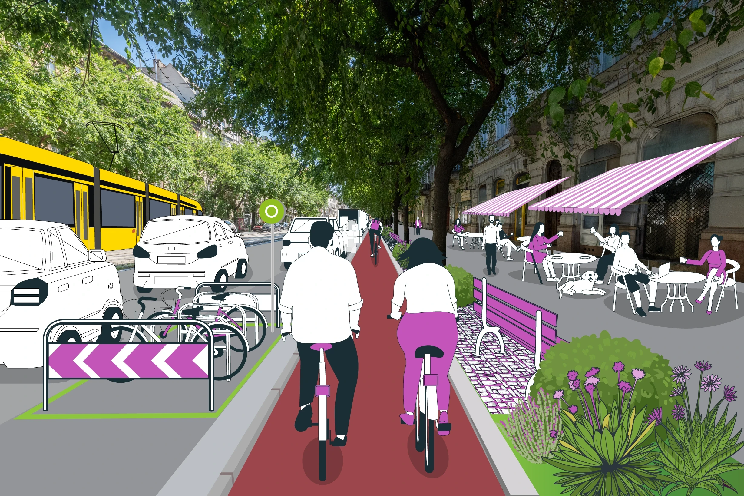 A fejlesztés keretében a Nyugati tér és a Boráros tér között kétoldali, fizikailag elválasztott kerékpársávok jönnek létre, a parkolósávos szakaszon pedig a parkolás a szegély mellett, rendezett keretek között történik. A kerékpárosok számára folyamatos és biztonságos kapcsolatok alakulnak ki, a csomópontokban is minden irányban. A kerékpársávok mentén szakaszosan biztosítjuk a parkolás és rakodás rendezett lehetőségét. A Nagykörút mentén a mellékutcák torkolatait járdaszintre emeljük, így a gyalogosok elsőbbséget kapnak.