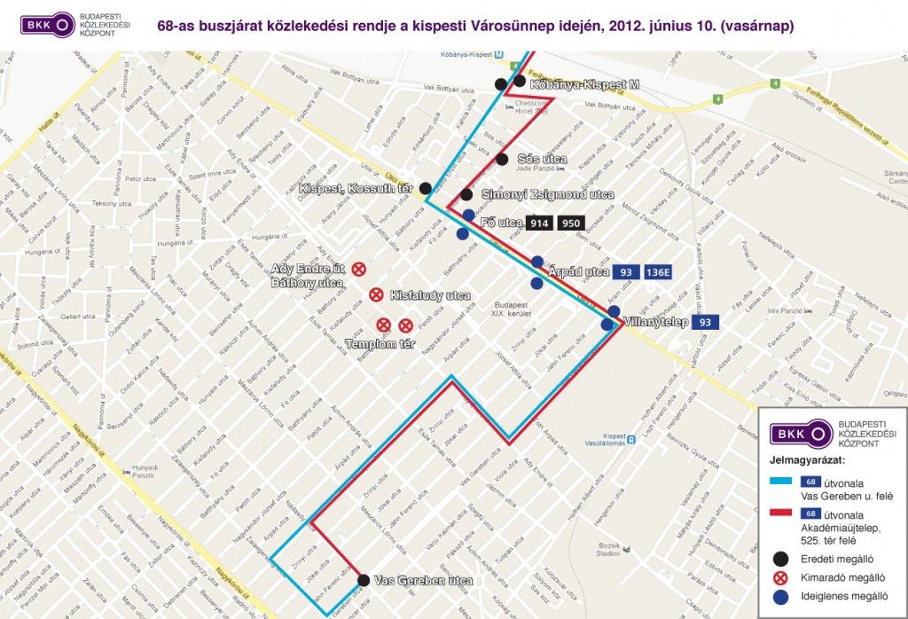Június 10-én, vasárnap a 68-as autóbuszok a Kispest, Kossuth tér és a Kossuth Lajos utca, illetve az Ady Endre út és a Simonyi Zsigmond utca közötti szakaszon – a lezárás miatt – módosított útvonalon közlekednek. A Vas Gereben utca irányában a 68-as buszok nem érintik az Ady Endre út (Báthory utca) és a Templom tér megállókat, amelyek helyett a buszokra terelt útvonalukon a 914-es és a 950-es járatok Fő utca, Árpád utca és Villanytelep megállóiban lehet felszállni. Az Akadémiaújtelep, 525. tér irányában a 68-as buszok nem érintik a Templom tér és a Kisfaludy utca megállókat, amelyek helyett a buszokra terelt útvonalukon a 914-es és a 950-es járatok Villanytelep, Árpád utca és Fő utca megállóiban lehet felszállni.