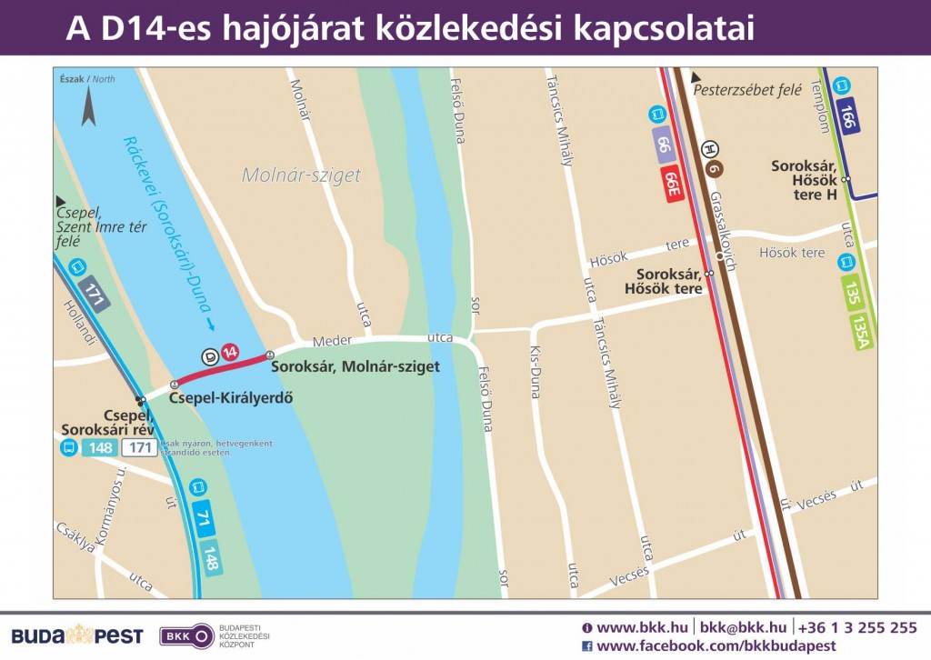 A Budapesti Közlekedési Központ (BKK) a közszolgáltatások körébe vonja az eddig Soroksári révként ismert, a XXI. és a XXIII. kerületet a Dunán át összekötő kompjáratot, és az március 15-étől (szombat) D14-es számjelzésű hajójáratként a közszolgáltatásokba vonva közlekedik. A rév menetrendje nem változik: Csepel-Királyerdő és Soroksár, Molnár-sziget között közlekedik • hétköznapokon 7:00–20:00 között 30 percenként, • hétvégén 7:25-kor, majd 8:00–20:00 30 percenként.