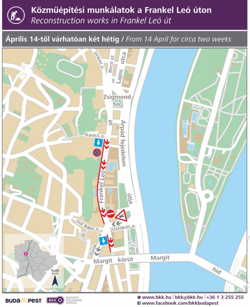 A Frankel Leó utca forgalmát 2014. április 14-étől (hétfőtől) a Lukács fürdő és Üstökös utca, 16-ától (szerdától) az Üstökös utca és Vidra utca, 18-ától (péntektől) pedig a Komjádi Béla utca és a Frankel Leó utca 58. szám közötti részen is a Margit körút felé egyirányúsítjuk, előreláthatólag két hétre.