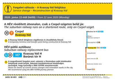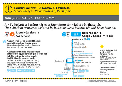 - a H7-es HÉV rövidített útvonalon, Csepel végállomás és a Kvassay híd csepeli oldalán kialakított ideiglenes HÉV-végállomás között közlekedik, időszakos menetrend szerint, amely hamarosan elérhető lesz a BKK honlapján.