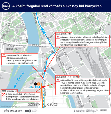 - A Weiss Manfréd úti buszforduló, valamint a centrum irányába vezető buszsávhoz kapcsolódóan a Weiss Manfréd úton hétköznap 10 órától másnap reggel 6 óráig, Csepel felé pedig este 20 órától másnap délután 14 óráig, továbbá hétvégén bármikor időszakos sávkorlátozás várható, ilyen esetben az adott irányba csak egy forgalmi sávon lehet majd haladni.