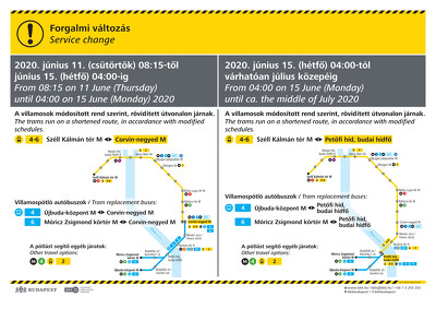 - Június 15-én, hétfőn hajnali 4 órától július 16-ig a nagykörúti villamosok a Széll Kálmán tér és a Petőfi híd, budai hídfő között közlekednek. A Petőfi híd, budai hídfőtől villamospótló busz közlekedik tovább Újbuda-központ felé 4-es, a Móricz Zsigmond körtér felé 6-os jelzéssel, amelyre a villamosmegállókkal párhuzamos buszmegállókban lehet felszállni.