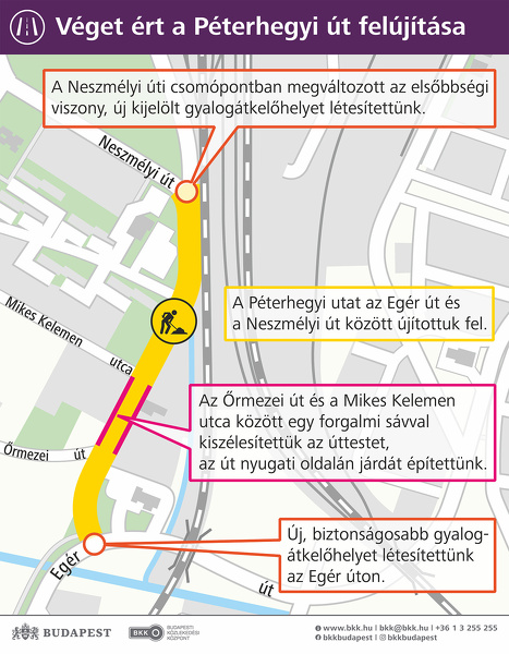 Teljesen elkészült az útpálya az újbudai Péterhegyi úton, ezért november 18-án, csütörtökön visszaáll az eredeti forgalmi rend: az Egér út és a Neszmélyi út közötti szakaszon a közúti forgalom ismét két irányba haladhat.