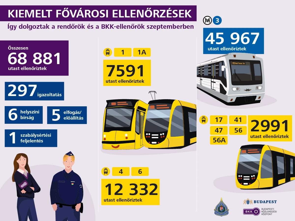 Budapest, 2025. október 3. – Szeptemberben is nagyszabású járatellenőrzéseket tartottak a fővárosban: a Budapesti Rendőr-főkapitányság (BRFK) és a Budapesti Közlekedési Központ (BKK) munkatársai a FÖRI-rendészekkel együttműködve csaknem 70 ezer utast ellenőriztek, miközben a megállókat, állomásokat és azok környezetét is vizsgálták. Az egész évben folyamatos, összehangolt akciókhoz tartoznak a háromnapos komplex járatellenőrzések is, amelyek a BKK kezdeményezésére megvalósuló köztisztasági és közrendvédelmi megmozdulásokhoz kapcsolódnak. Az akciók célja, hogy növeljék a közösségi közlekedést használók biztonságérzetét, és hozzájáruljanak a szolgáltatás színvonalának folyamatos javításához.