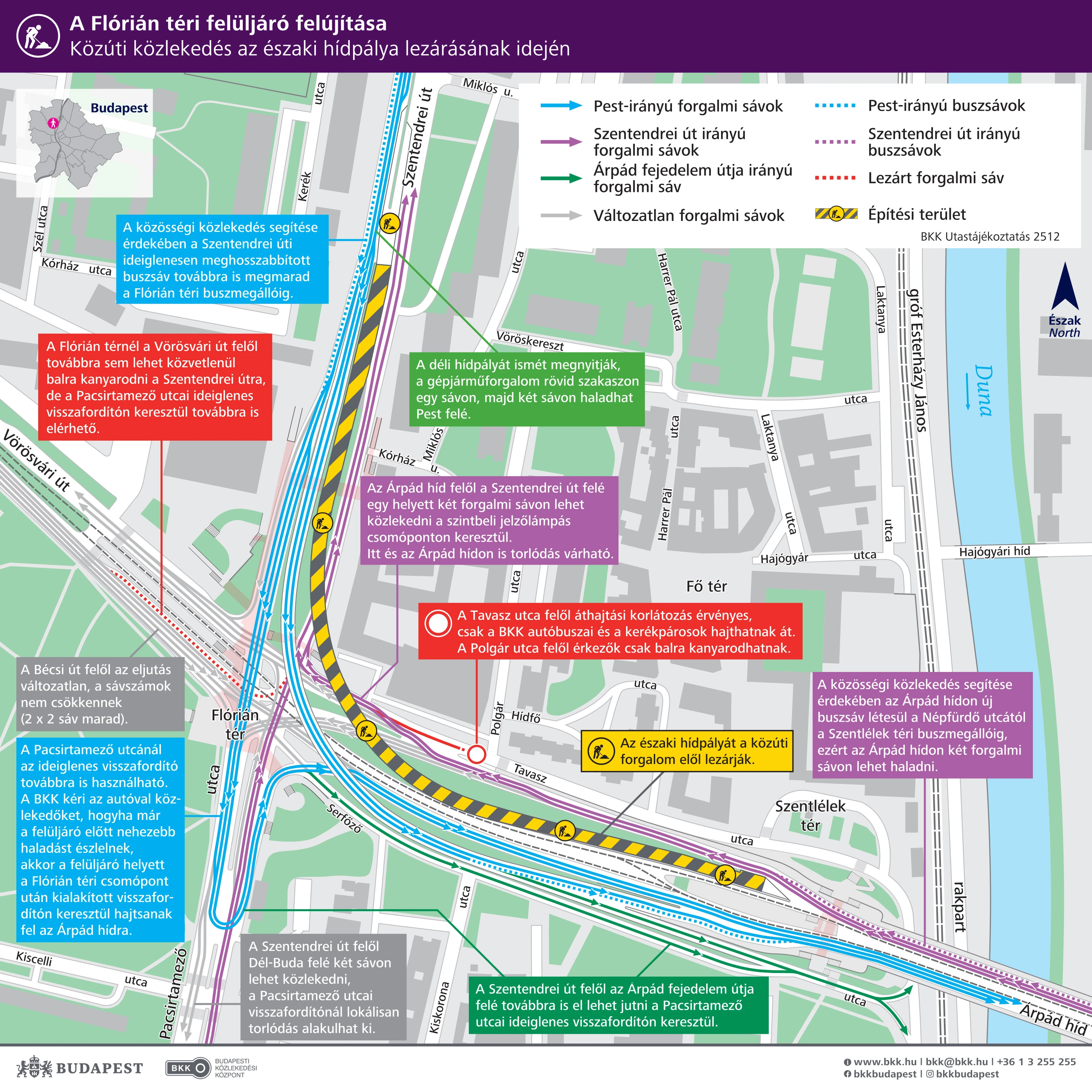 Az Árpád híd és a Flórián téri csomópont áteresztőképessége az Árpád híd felől Buda, illetve Észak-Buda felé lényegesen kisebb lesz, mint a felújítás első ütemében. Ezért a BKK kéri az arra közlekedőket és az agglomerációból érkezőket (vagy oda tartókat), hogy – lehetőségük szerint – a közösségi közlekedést, azon belül is elsősorban a nagykapacitású kötöttpályás járatokat vegyék igénybe, ezzel csökkentve a Flórián tér és környékének forgalmi terhelését. Emellett azt tanácsolja a személy- és az egyéb gépjárművel közlekedőknek, hogy Pest felől az Árpád hidat lehetőleg elkerülve, másik híd használatával közelítsék meg az úti céljukat.