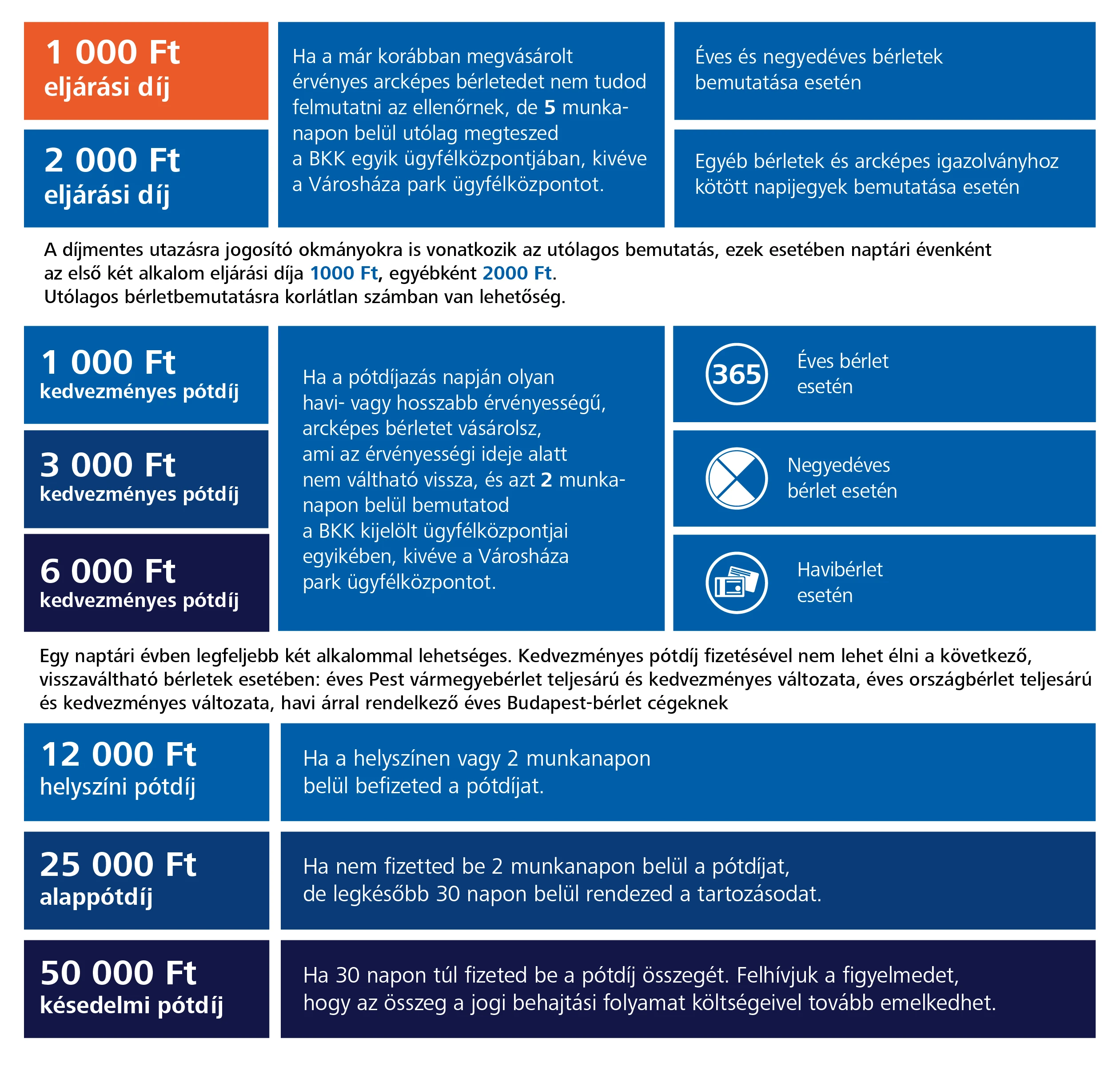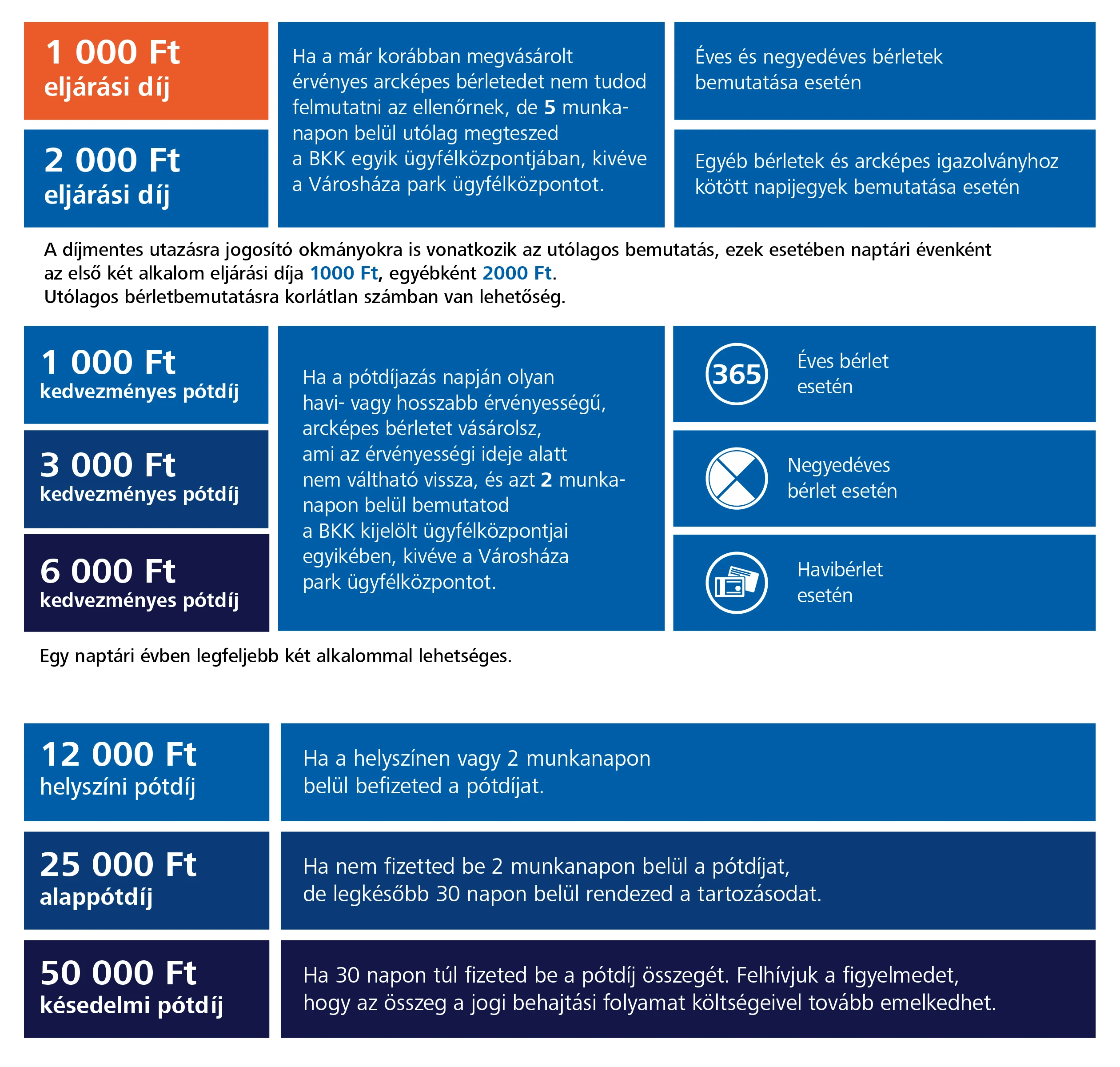 Így jelentősen mérséklődik a kifizetendő pótdíj összege: a bérlet, az igazolványhoz kötött napijegy és a díjmentes utazáshoz használt hatósági irat bemutatásakor a pótdíjbehajtási folyamat az eljárási díj kifizetésével megszűnik. Az eljárási díj éves, negyedéves bérlet vagy naptári évenként az első két alkalommal az ingyenes utazási jogosultságot igazoló hatósági irat bemutatásakor 1 000 forint, egyéb bérleteknél, illetve olyan Budapest 24 órás jegynél vagy Budapest 72 órás jegynél, amit mobilalkalmazásban vásároltál, továbbá díjmentes utazásra jogosító iratoknál naptári évenként a harmadik alkalomtól 2 000 forint.