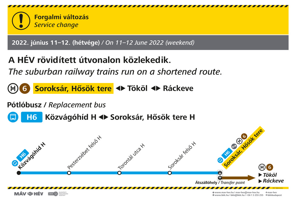 Budapest, 2022. június 10. – A H6-os HÉV június 11-én és 12-én, szombaton és vasárnap csak Soroksár, Hősök tere és Tököl, illetve Ráckeve között közlekedik. Soroksár, Hősök tere és a Közvágóhíd között a H6-os pótlóbusszal lehet utazni.