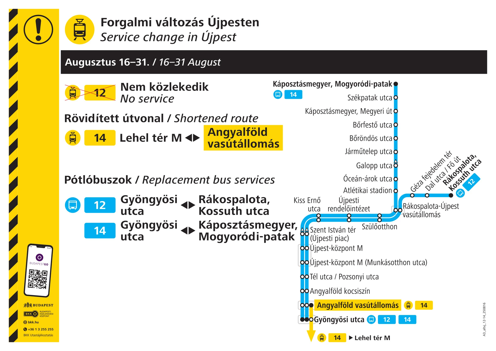Karbantartás kezdődik augusztus 16-án, szombaton a 12-es és a 14-es villamosok vonalán. Augusztus 31-ig a 12-es villamos helyett pótlóbusz közlekedik a Gyöngyösi utca és Rákospalota, Kossuth utca között.
