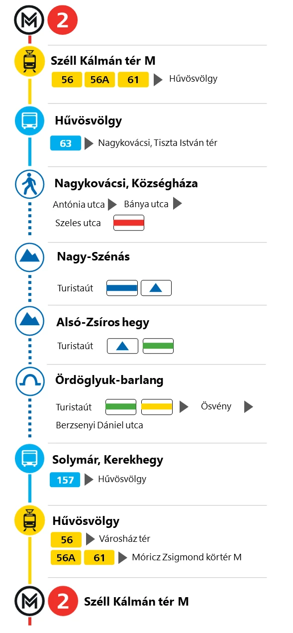 | Ha a túrát az ellenkező irányból kezded, akkor a túra végén, Hűvösvölgyben felpattanhatsz a Széchenyi-hegyi Gyermekvasútra. Azzal keresztülvonatozhatsz a Hárshegy–Jánoshegy–Normafa–Széchenyi-hegy útvonalon. Ha a Normafánál szállsz le, akkor a 21-es autóbuszcsaláddal; ha pedig a Széchenyi-hegyig mész tovább, akkor a fogaskerekűvel és villamossal jutsz el a Széll Kálmán térre. |
