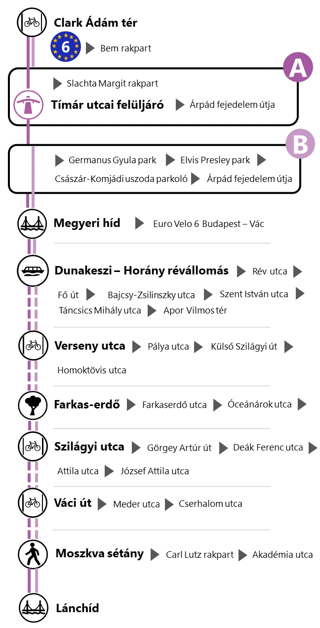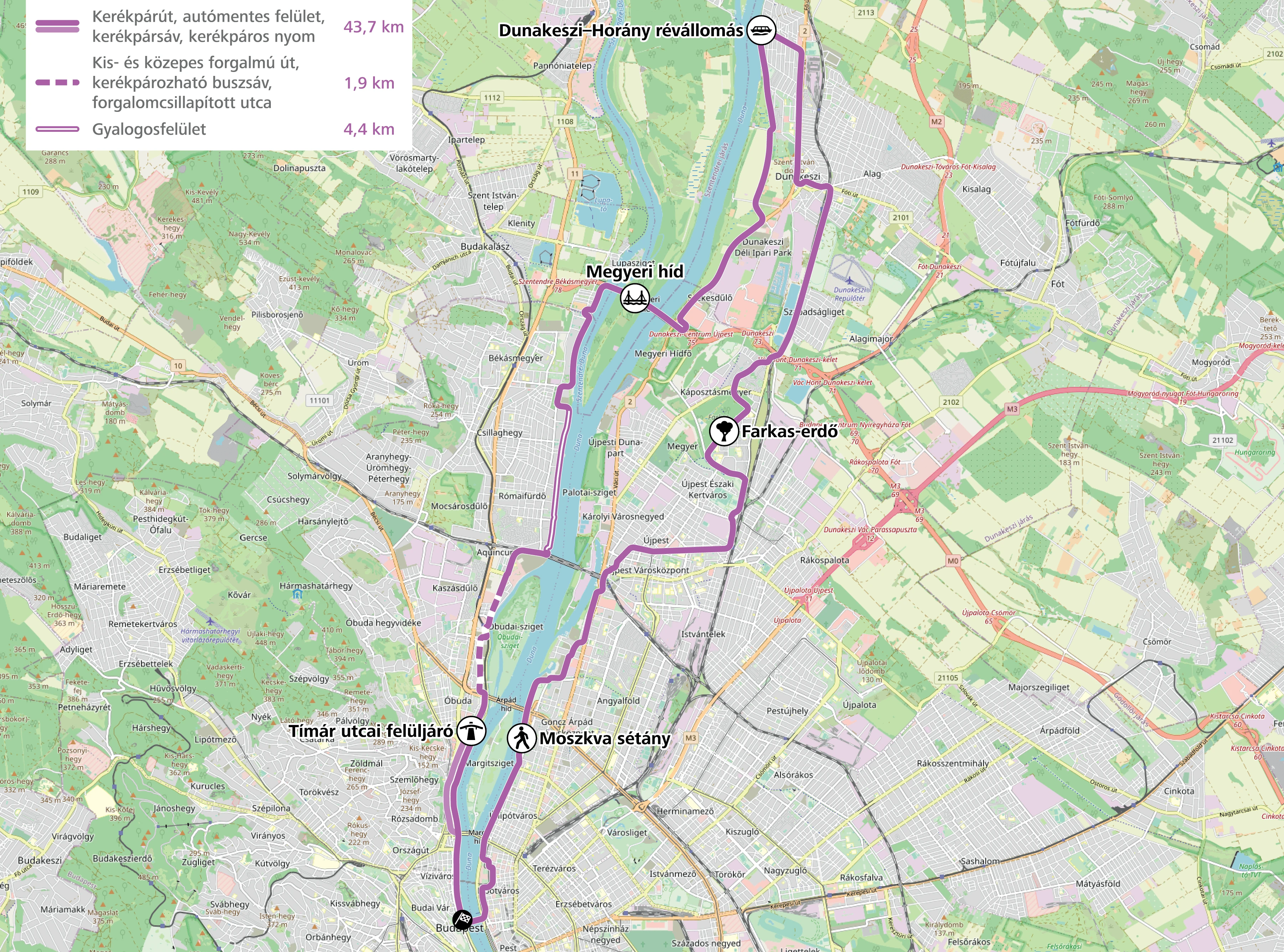Túránk kiindulópontja a Clark Ádám tér, ami a dunakeszi Duna-parthoz vezet. A budai oldalon kiépített, EuroVelo 6 útvonalon, a Dunával párhuzamosan futó védett kerékpárúton haladjatok egyenesen, egészen a Margit hídig. A hídtól felfelé választhattok, hogy a HÉV mellett futó védett kerékpárúton vagy az Árpád fejedelem útján újonnan kijelölt kerékpársávon haladtok tovább az Árpád híd irányába. Az Árpád hidat elhagyva a Szentlélek téren keresztül az út Óbuda macskaköves főterén vezet a Laktanya utcáig. Itt kerékpáros nyomon tudtok végigmenni a Folyamőr utcán, ahol forduljatok jobbra, a Ladik utcára. A Filatorigát vasúti átjáróján fokozott figyelemmel keresztülhaladva folytassátok az utat a HÉV vonalával párhuzamosan, ahol a gyalogos- és kerékpáros átvezetés után kanyarodjatok jobbra, a Mozaik utca mellett futó kerékpárútra, majd az első lehetőségnél balra fordulva haladjatok végig a Leányfalu utcán a betonelemekkel elválasztott kerékpársávon. Az utca végén jobbra a Reményi Ede utcán folytatódik az útvonal, ami az Ángel Sanz Briz út melletti védett kerékpárútra vezet. A Gázgyár utcán végighaladva értek ki a Római-part–Kossuth Lajos üdülőpartra. A Pünkösdfürdő-gáthoz érve a Szentendrei-Duna-ággal párhuzamosan menjetek végig az úton, ahol a Barát-patak-átkelőn áttekerve, jobbra kanyarodva a Duna-sétányra értek. Ezen az útvonalon vezet tovább egyenesen a kerékpárút, ahol egy tábla jelöli a felhajtást a Megyeri hídra, és balra kanyarodva rátérünk a hídra felvezető útra. A hídon áthaladva a lehajtó után kanyarodjatok jobbra, Dunakeszi irányába. A Váci út/2. számú főút mentén végig kiépített, védett kerékpárúton haladjatok egyenesen, egészen a Burger King gyorsétterem mellett lévő körforgalomig. Itt a kerékpárút átvezet a körforgalmon, ahol a kerékpáros útirányjelző tábla (zöld alapon sárga írás) alapján haladjatok tovább a kerékpárúton Vác/Göd irányába. A festői környezetben vezető út egészen Dunakeszi, Folyam utca becsatlakozásig tart, ahol forgalomcsillapított, kerékpáros nyomvonallal jelölt utcán haladjatok tovább északra, Duna sor irányába. Az útvonal egészen a Dunakeszi–Horány kompkikötőig tart, ahol jobbra kanyarodva haladjatok tovább a Rév utcán, egészen a Dunakeszi Városi Sportcsarnokig, itt jobbra kanyarodjatok rá a védett kerékpárútra, amely végig a Fő út mellett fut. A Fő utca–Nap utca kereszteződéstől az útvonal kerékpársávon halad tovább. A Fő utcán haladva elérkeztek a Városházáig, itt balra kanyarodva folytassátok az utat a Bajcsy-Zsilinszky utcán, ahol az út végén balra kanyarodva térjetek rá a Szent István utcára, ami a Táncsics Mihály utcára vezet. Ezen végighaladva éritek el az Apor Vilmos téri kerékpárutat, ami a Verseny útra visz. Itt több kilométeren keresztül a Pálya utca mentén kiépített kerékpárút egészen az M0-sig fut. Ez alatt áthaladva folytassátok az utat a Külső Szilágyi úton, ahol egy idő után jobbra kanyarodva térjetek le a Homoktövis utcára, ami 30-as zónákkal rendelkező útszakasz. A Homoktövis utca átvezet a Farkas-erdőn – ami a káposztásmegyeri lakótelep szomszédságában terül el az 51,7 hektáros kiterjedésével – majd kiér a Farkaserdő utcára, ahol jobbra kanyarodva, majd az az út végéhez érve forduljatok az Óceánárok utcára, ami elvezet a Szilágyi utca mellett futó kerékpárútra. Egészen a Rákospalota-Újpest vasútállomásig ezen úton tekerjetek, majd kanyarodjatok a Görgey Artúr útra, ahol kerékpárúton tudtok továbbmenni. Innen a Deák Ferenc utcán haladva forduljatok balra az Attila utcára, ahonnan egy idő után kanyarodjatok jobbra a József Attila utcára, és visszajuttok a Váci út mellett futó kerékpárútra. A kerékpárút a Duna Plázáig tart, itt jobbra fordulva folytassátok az utat a Meder utcán és Cserhalom utcán, ami kivezet a pesti Duna-parti kerékpárútra, ahol a Moszkva sétányon végighaladva folytassátok az utat a Carl Lutz rakparti kerékpárúton. A Margit híd alatt áthajtva, a Parlamentet megkerülve kanyarodjatok az Akadémia utcára, ami kivezet a Széchenyi István térre, ahol a Lánchídon át visszaértek a kiindulóponthoz, a Clark Ádám térhez.